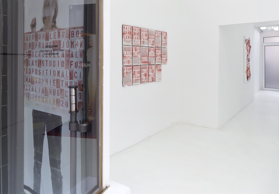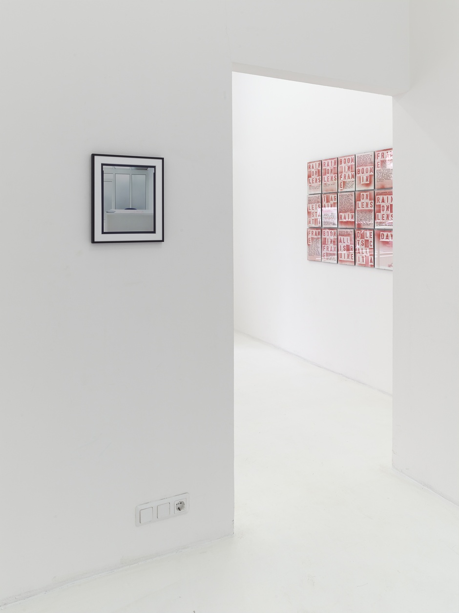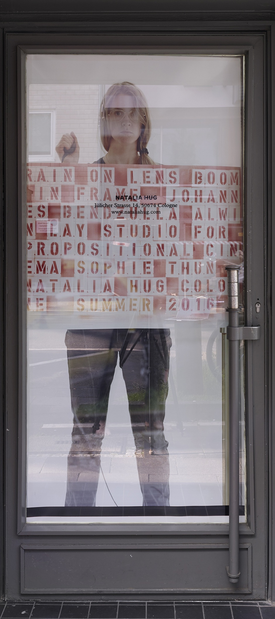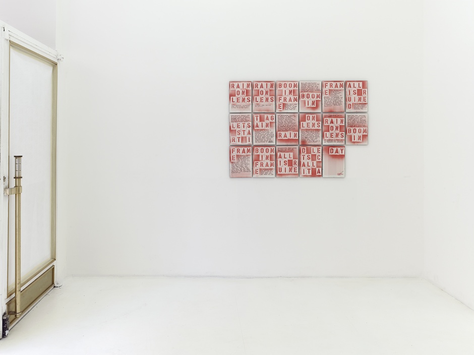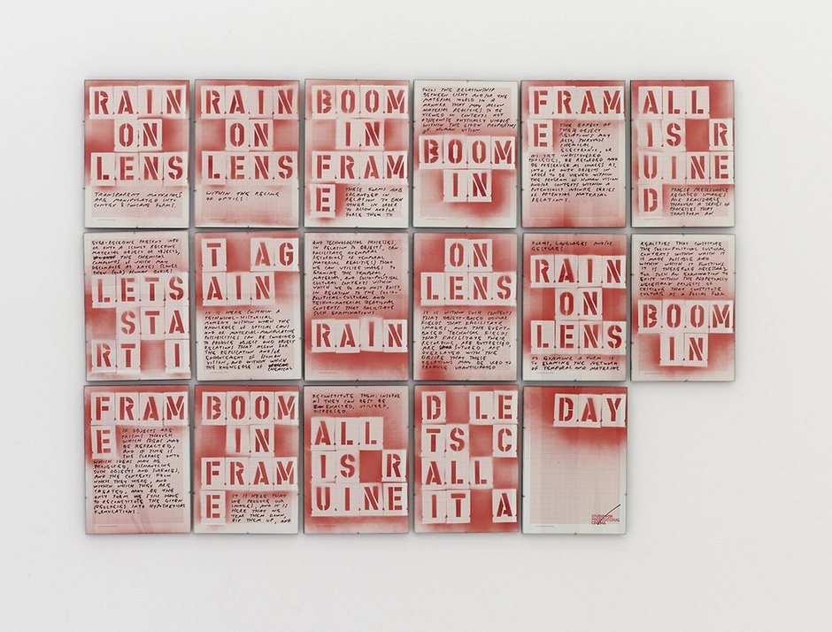 Studio for Propositional Cinema, RAIN ON LENS BOOM IN FRAME..., pigment ink, stamp ink, spray paint on offset prints, 29.7 x 21 cm (each), in seventeen parts, Overall dimensions: 91 x 131 cm